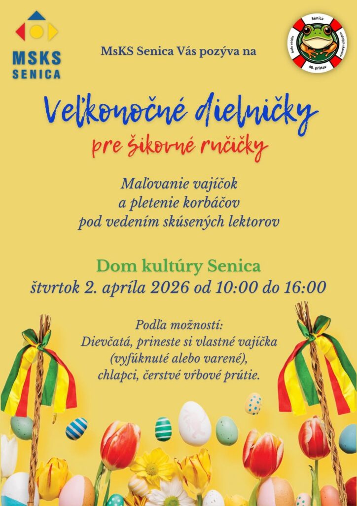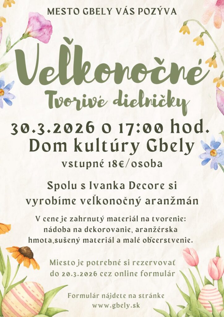Veľkonočný víkend bude bohatý aj na program pre deti. V Gbeloch sa uskutočnia Veľkonočné tvorivé dielničky, kde si účastníci spolu s Ivanka Decore vyrobia veľkonočný aranžmán. Podujatie sa bude konať 30. marca 2026 o 17.00 hod. v Dome kultúry Gbely. V cene vstupného je zahrnutý materiál na tvorenie aj malé občerstvenie.