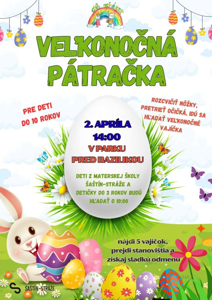 V Šaštíne-Strážach pripravili pre deti do 10 rokov Veľkonočnú pátračku, ktorá sa uskutoční 2. apríla o 14.00 hod. v parku pred bazilikou. Menšie deti do 3 rokov budú hľadať už dopoludnia o 10.00 hod. Organizátori sľubujú hľadanie vajíčok, pohyb na čerstvom vzduchu a sladkú odmenu.