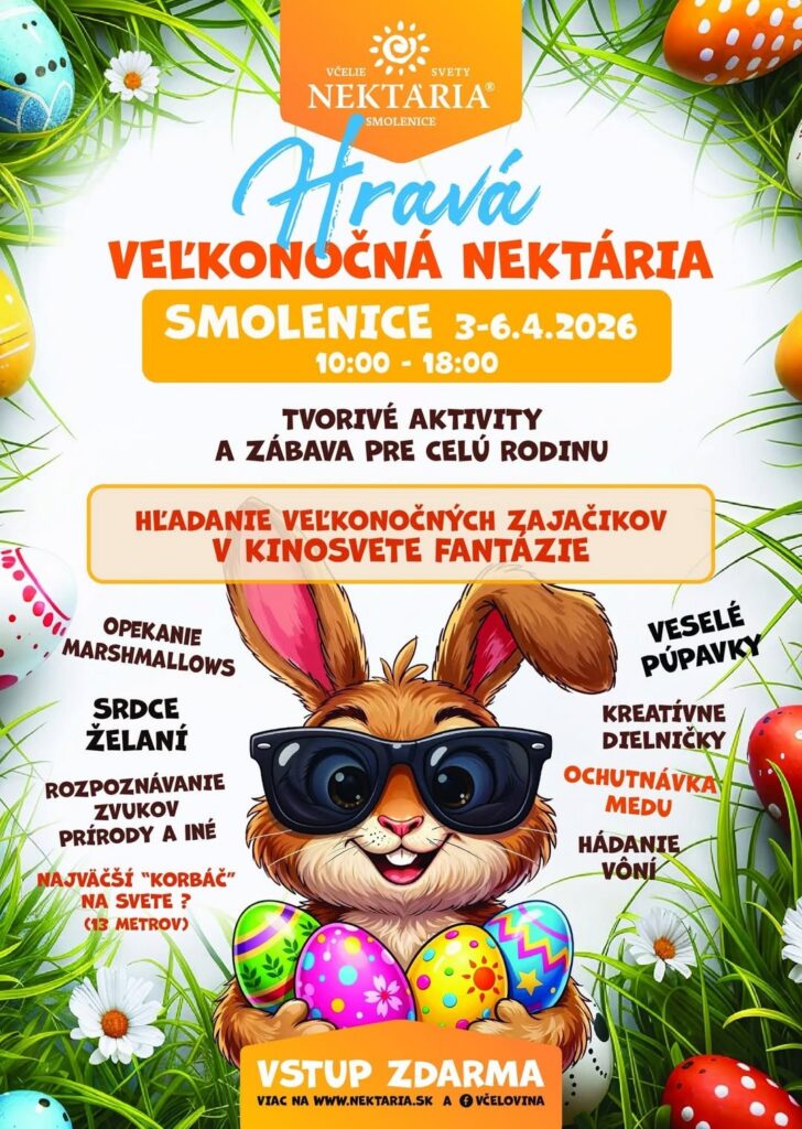 Veľkonočný program pre rodiny chystá aj Nektária Smolenice, kde sa od 3. do 6. apríla 2026 v čase od 10.00 do 18.00 hod. uskutoční Hravá veľkonočná Nektária. Návštevníkov čakajú tvorivé aktivity, hľadanie veľkonočných zajačikov, ochutnávka medu, kreatívne dielničky aj ďalšie stanovištia pre celú rodinu.