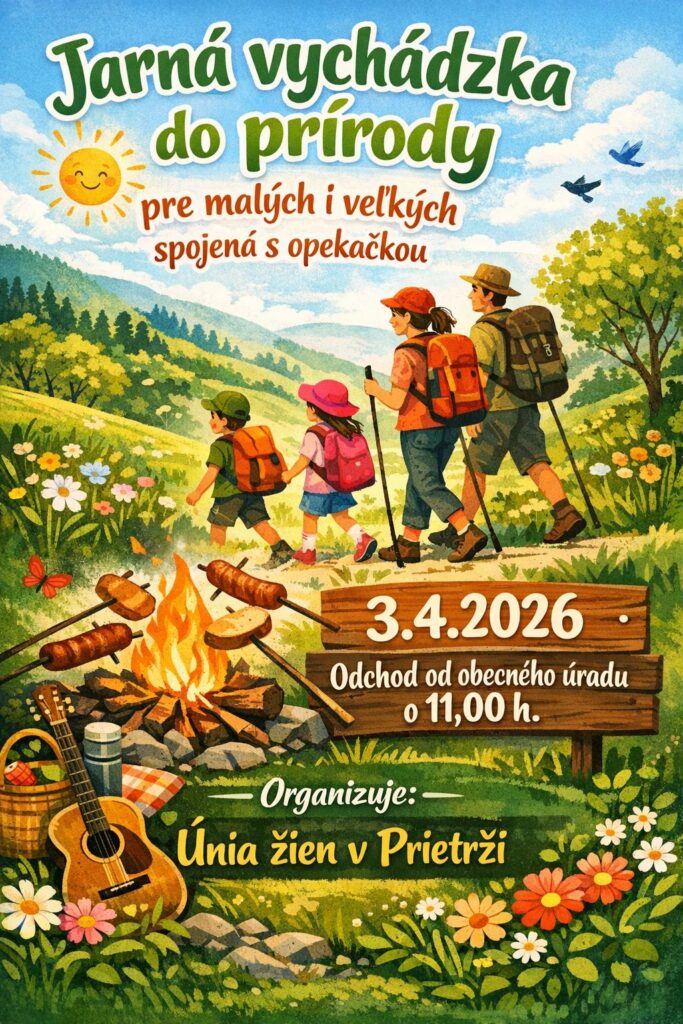 Sviatočné dni môžu byť aj príležitosťou vyraziť do prírody. V Prietrži pripravila Únia žien podujatie Jarná vychádzka do prírody pre malých i veľkých spojená s opekačkou. Uskutoční sa 3. apríla 2026, odchod je o 11.00 hod. od obecného úradu. Ide o príjemný tip na spoločný rodinný čas v jarnej prírode.