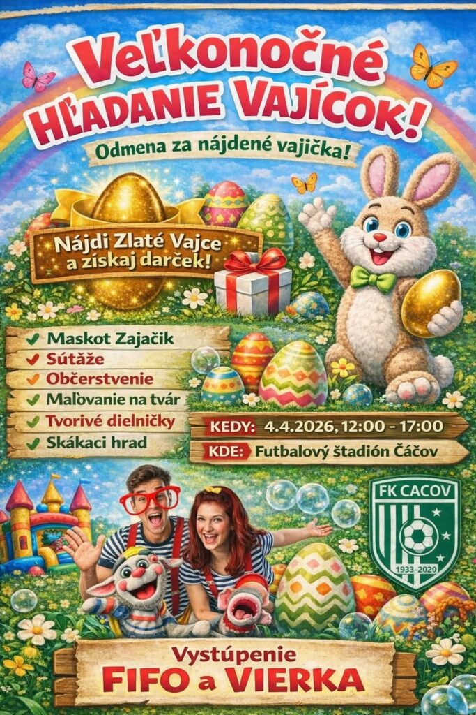 Ďalšie hľadanie vajíčok chystajú aj v Čáčove, kde sa uskutoční podujatie Veľkonočné hľadanie vajíčok. Program ponúkne maskota zajačika, súťaže, občerstvenie, maľovanie na tvár, tvorivé dielničky aj skákací hrad. Konať sa bude 4. apríla 2026 od 12.00 do 17.00 hod. na futbalovom štadióne Čáčov.