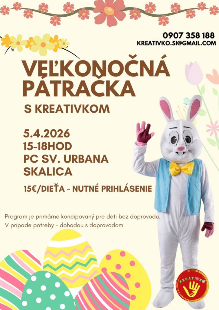 V Skalici sa zase pripravuje Veľkonočná pátračka s Kreativkom, určená primárne pre deti bez doprovodu. Podujatie sa uskutoční 5. apríla 2026 od 15.00 do 18.00 hod. v PC sv. Urbana v Skalici.
