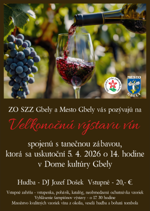 V Gbeloch sa bude konať Veľkonočná výstava vín spojená s tanečnou zábavou. Podujatie je naplánované na 5. apríla 2026 o 14.00 hod. v Dome kultúry Gbely. Návštevníci sa môžu tešiť na degustáciu, hudbu, tombolu aj vyhlásenie šampiónov výstavy.