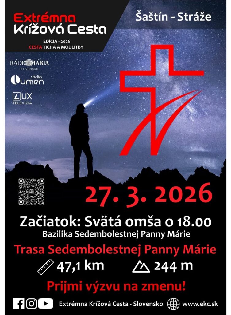 Silný duchovný aj osobný rozmer bude mať Extrémna krížová cesta, ktorá sa uskutoční v piatok 27. marca 2026 v Šaštíne-Strážach. Účastníkov čaká trasa Sedembolestnej Panny Márie s dĺžkou 47,1 kilometra. Podujatie sa začne svätou omšou o 18.00 hod. v Bazilike Sedembolestnej Panny Márie.