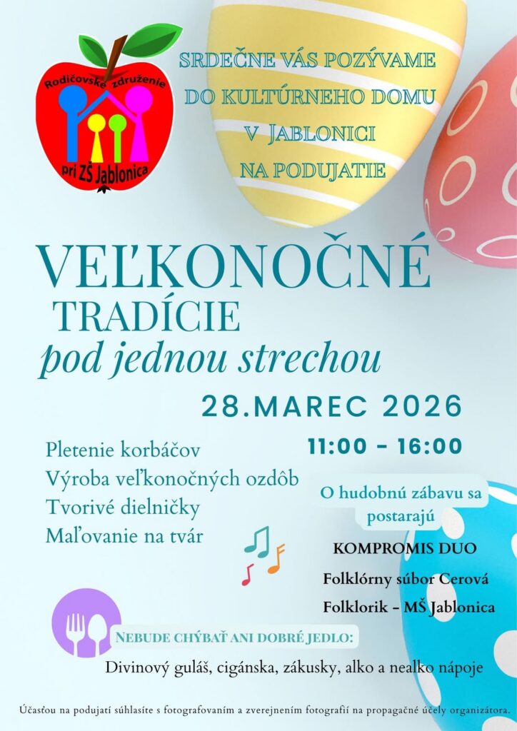 Sobota 28. marca bude patriť aj veľkonočným a tradičným podujatiam. V Jablonici sa v Kultúrnom dome uskutočnia Veľkonočné tradície pod jednou strechou, kde návštevníkov čaká pletenie korbáčov, výroba veľkonočných ozdôb, tvorivé dielničky aj maľovanie na tvár. Podujatie doplní hudobný program a občerstvenie. Konať sa bude od 11.00 do 16.00 hod.