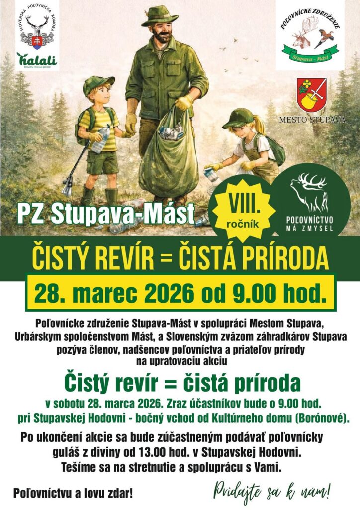 V Stupave-Máste sa upratovacia akcia uskutoční v sobotu 28. marca o 9.00 hod. Zraz účastníkov bude pri Stupavskej Hodovni – bočný vchod od Kultúrneho domu (Borónovej). Po skončení bude pre zúčastnených pripravený aj poľovnícky guláš z diviny.