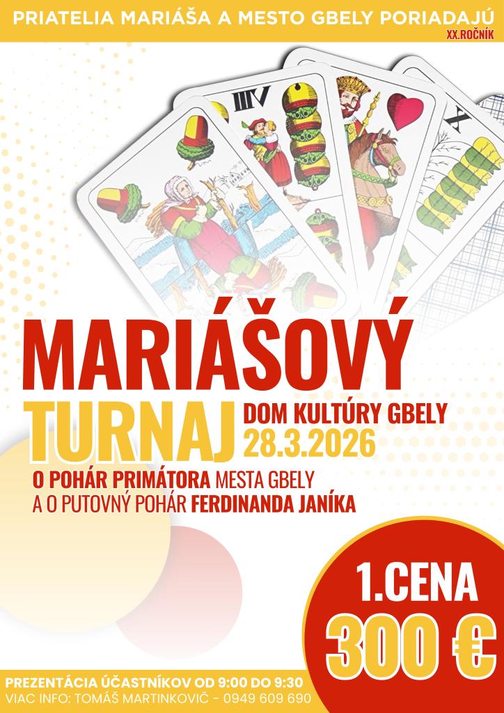 Zaujímavý program prinesú aj Gbely, kde sa v sobotu 28. marca 2026 uskutoční Mariášový turnaj o pohár primátora mesta Gbely a o putovný pohár Ferdinanda Janíka. Podujatie sa bude konať v Dome kultúry Gbely, pričom prezentácia účastníkov je naplánovaná od 9.00 do 9.30 hod.