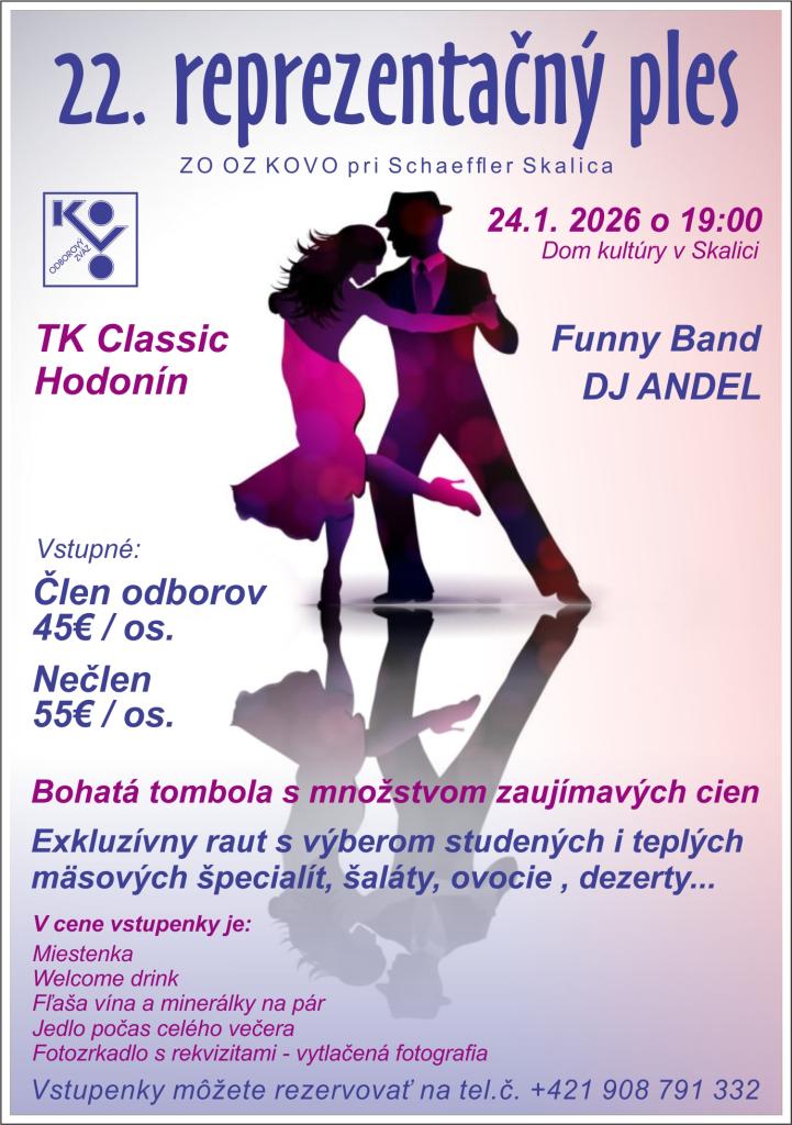 22. reprezentačný ples ZO OZ KOVO pri Schaeffler Skalica + Pridať do Kalendára Google + export iCal / Outlook 00 dni 00 hodiny 00 minút 00 sekúnd Dátum So 01 2026 Čas 19:00 - 23:55 Zdieľajte túto udalosť