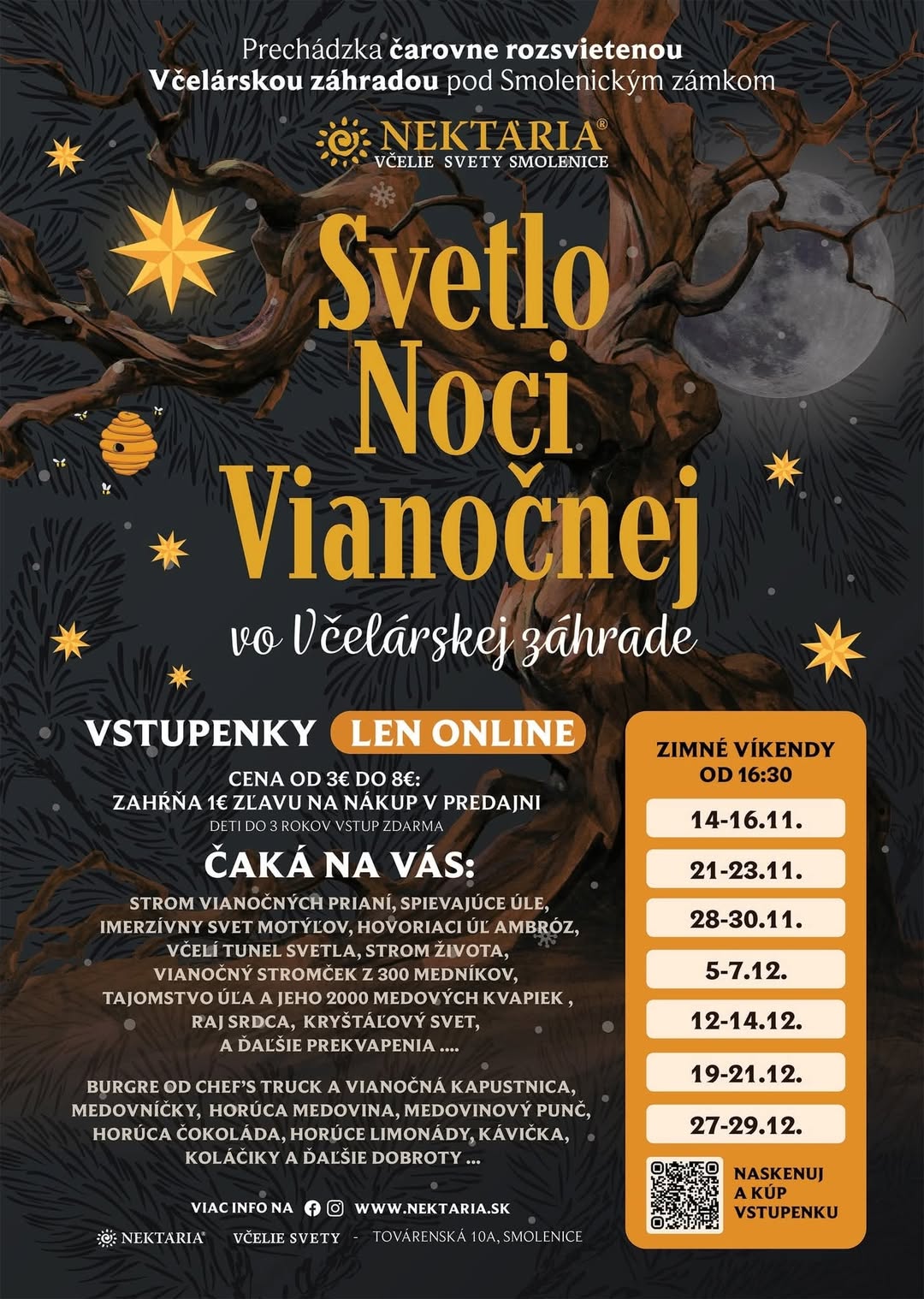 Svetlo Noci Vianočnej vo Včelárskej záhrade pod Smolenickým zámkom + Pridať do Kalendára Google + export iCal / Outlook 00 dni 00 hodiny 00 minút 00 sekúnd Dátum Pi 11 2025 - Po 12 2025 Prebieha... Čas 08:00 - 18:00 Zdieľajte túto udalosť
