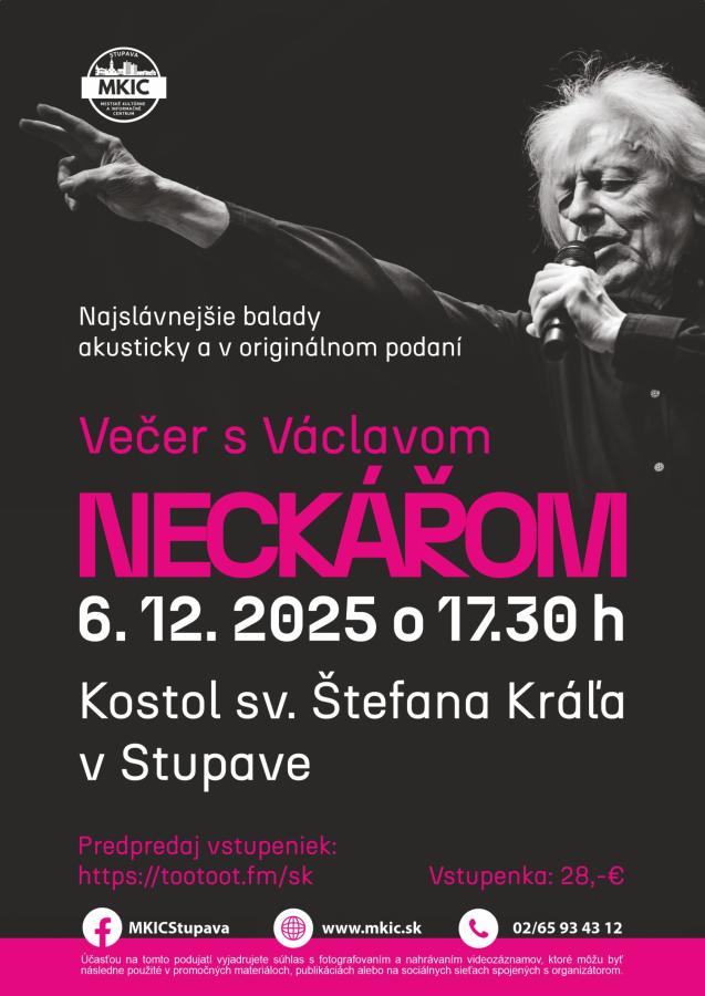 Večer s Václavom Neckářom – Stupava + Pridať do Kalendára Google + export iCal / Outlook Udalosť je ukončená. Dátum So 12 2025 Platnosť vypršala! Čas 17:30 - 20:00 Zdieľajte túto udalosť