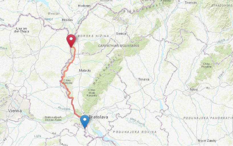 Trasa na Slovensku: Na naše územie vstupuje cez hraničný priechod Hohenau – Moravský Svätý Ján a pokračuje malebnou krajinou Záhoria cez obce Malé Leváre, Gajary, Suchohrad, Záhorskú Ves (najzápadnejšiu obec SR) až do Vysokej pri Morave. Odtiaľ smeruje k Devínskej Novej Vsi, popod majestátny hrad Devín, cez Bratislavu až do Petržalky, kde sa odpája smerom na rakúske Kittsee.
